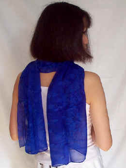 Made of 100% Silk Georgette, hand-colored by the salt solution technique, rich blue color, beautifully finished with hand-rolled edges. With a slightly matte finish, it's as light as a veil, and nearly transparent. Soft and comfortable to the skin. |