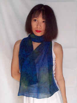 Made of 100% Silk Georgette, hand-colored by the salt solution technique, deep blue with green, beautifully finished with hand-rolled edges. With a slightly matte finish, it's as light as a veil, and nearly transparent. Soft and comfortable to the skin. |