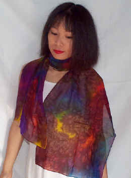 Made of 100% Silk Georgette, hand-colored by the salt solution technique, beautifully finished with hand-rolled edges. With a slightly matte finish, it's as light as a veil, and nearly transparent. Soft and comfortable to the skin. |